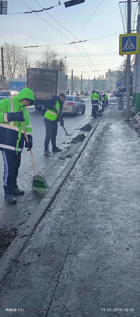 Ручная уборка зимних накоплений с прилотковой части дороги по ул. Свердлова, погрузка и вывоз смета